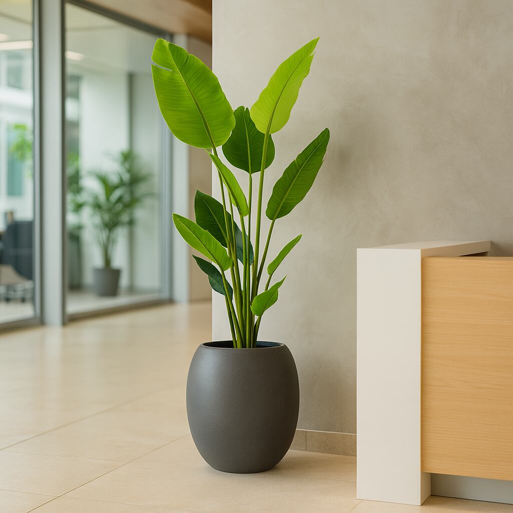 高級感溢れるマットな質感の黒陶器鉢カバーに、ストレリチアオーガスタを飾ったお洒落なインテリアグリーン