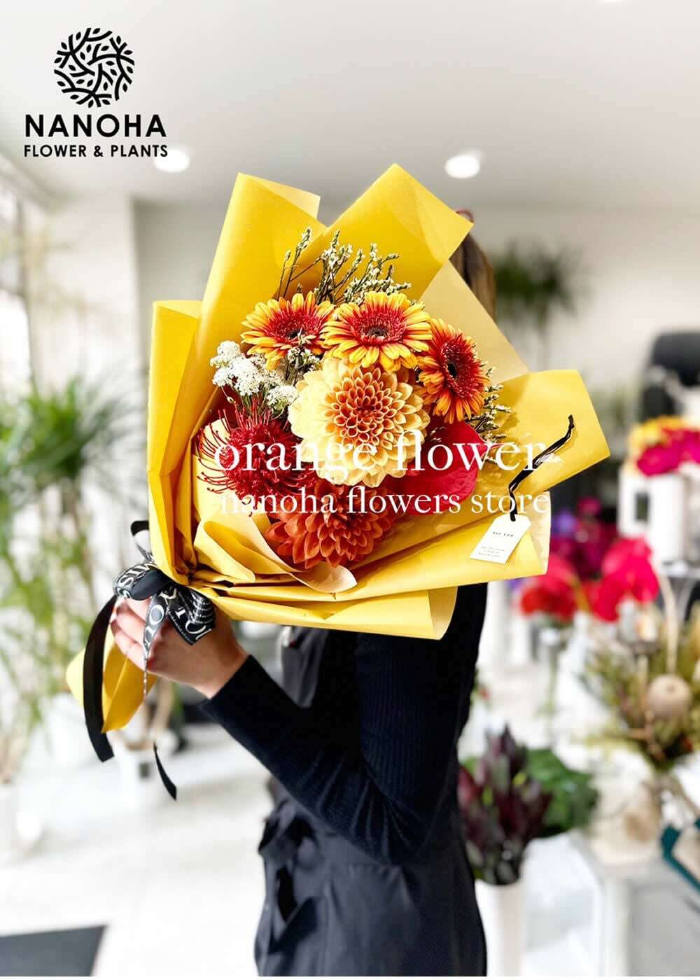 オレンジの花束。メインの花にダリアを加え、ガーベラの様に黄色いお花で装飾。明るい見た目で元気が貰えるデザインです。