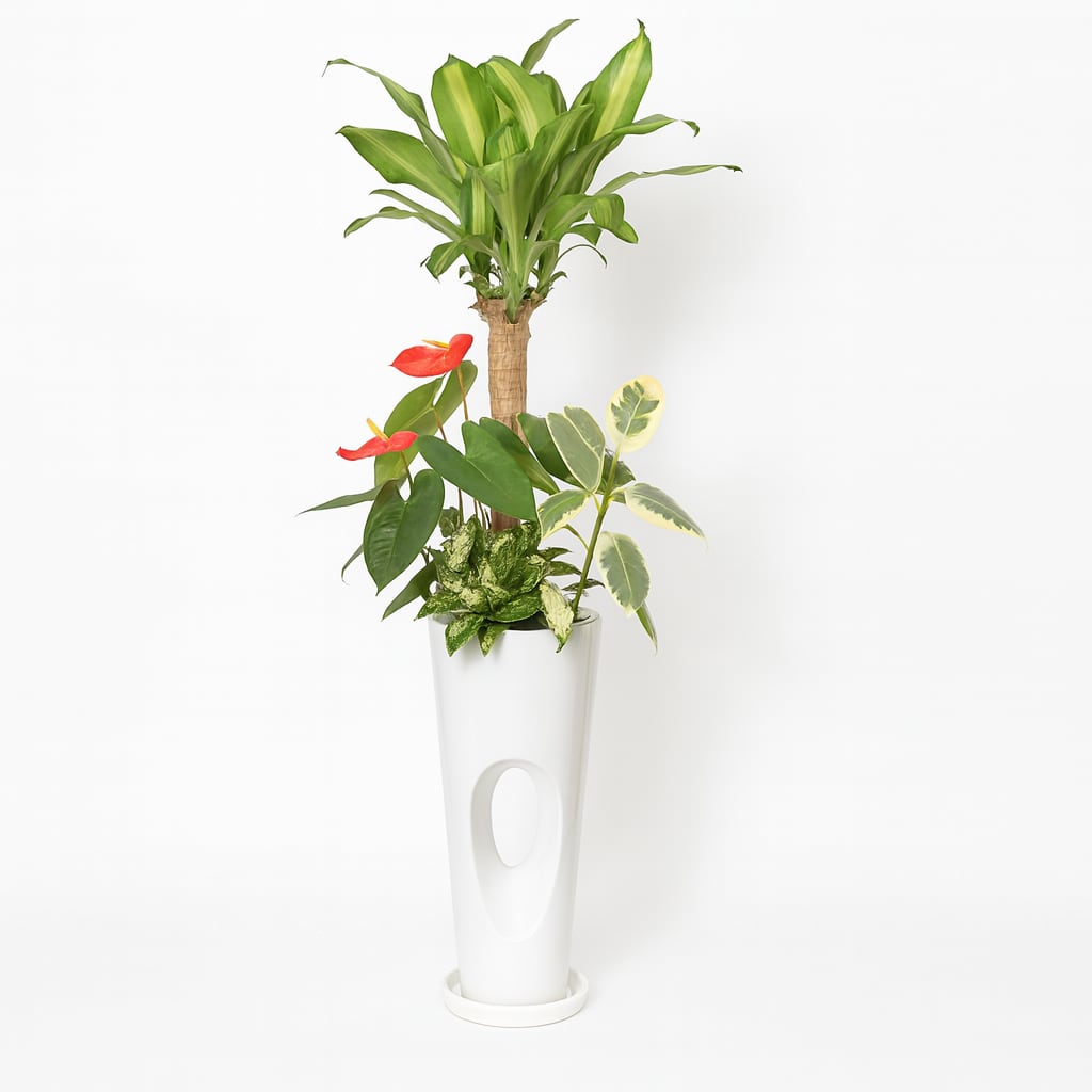縁起の良い観葉植物を詰め合わせた寄植え。お家のインテリアにはもちろん、様々なお祝いのシーンでも活用でき、空間の雰囲気をガラリと彩ります。農園さんから直送される商品になりますので、新鮮で元気な観葉植物をお届けできます