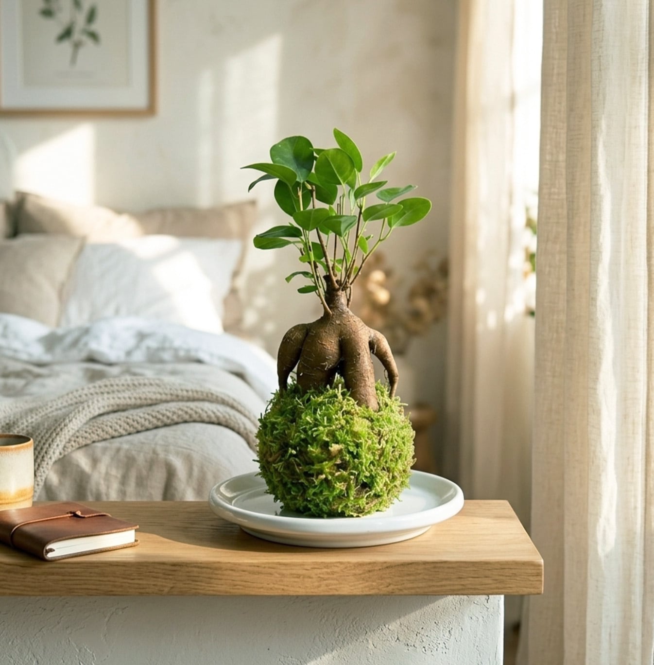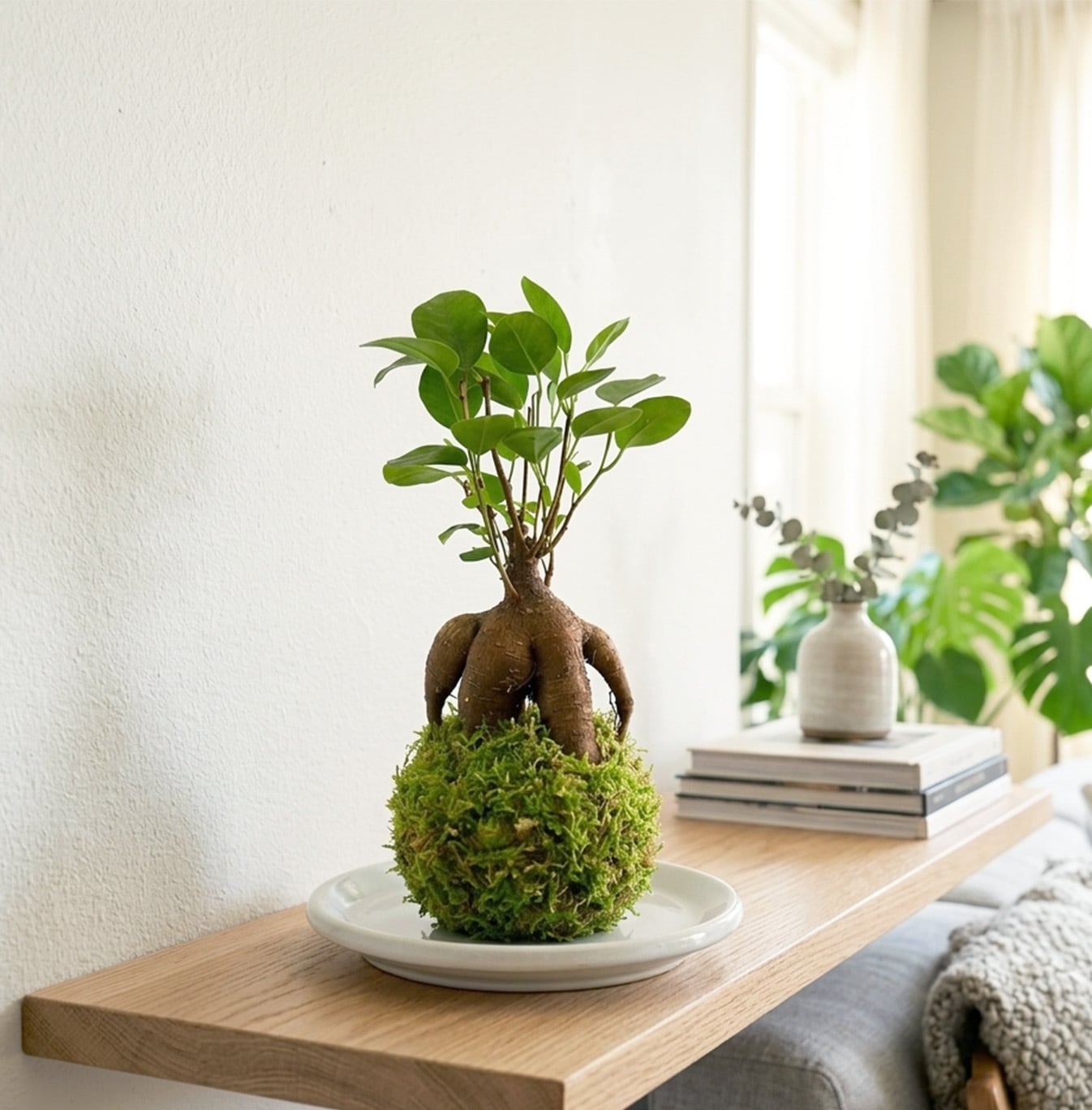 ユニークな形の幹が可愛らしいガジュマルを、苔玉仕立てにしたインテリアグリーン。