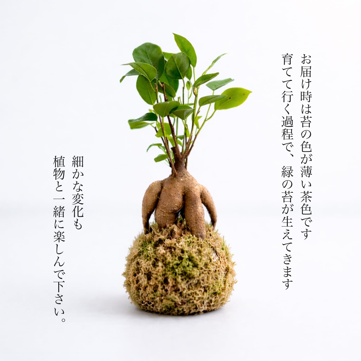 水やりなどをしっかり行なっていく過程で、苔はだんだん緑色に変化していきます。何卒、ご理解のほどよろしくお願い致します。