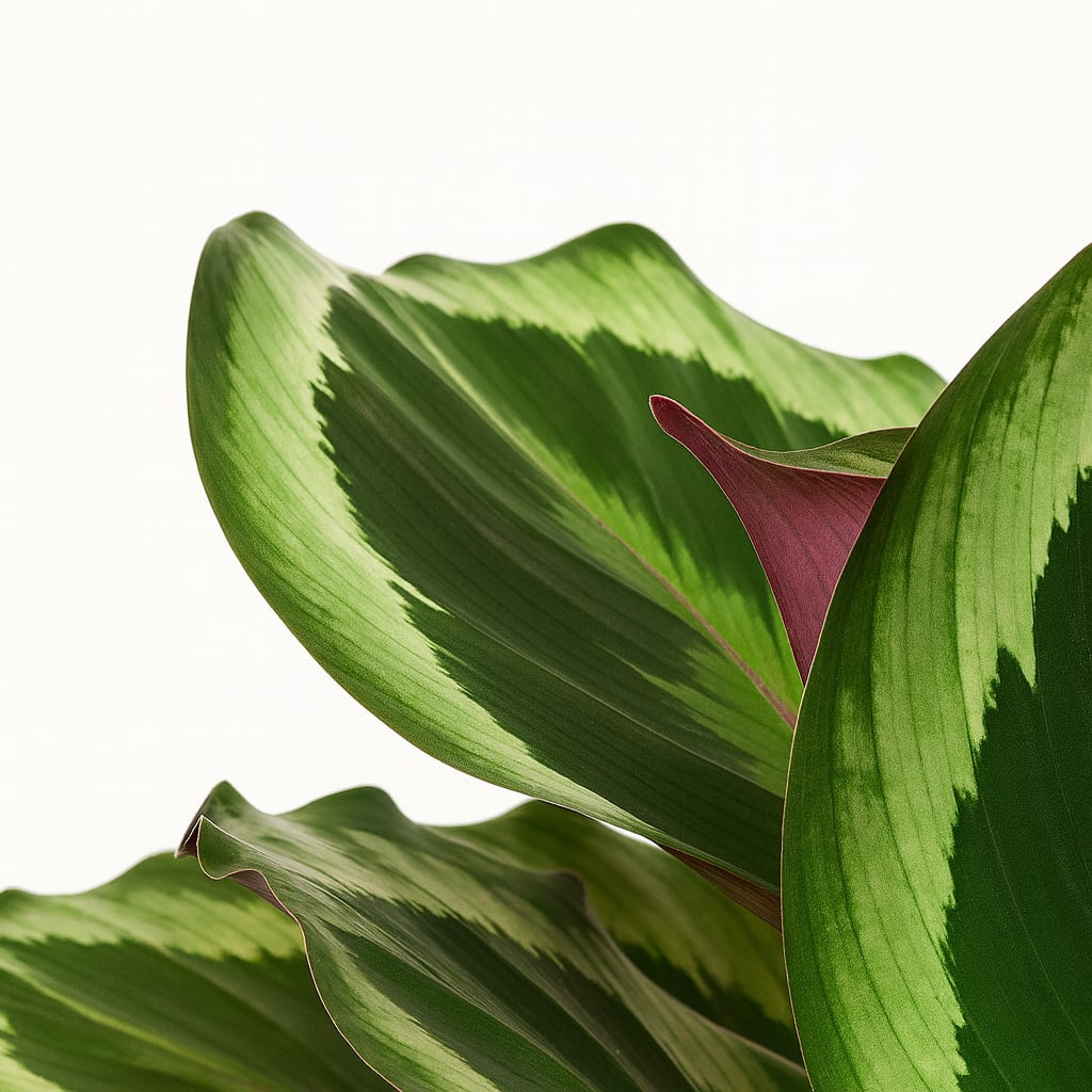 描いたような美しい葉の模様と、裏面に広がる赤紫色のコントラストが魅力のカラテア・シャインスター。