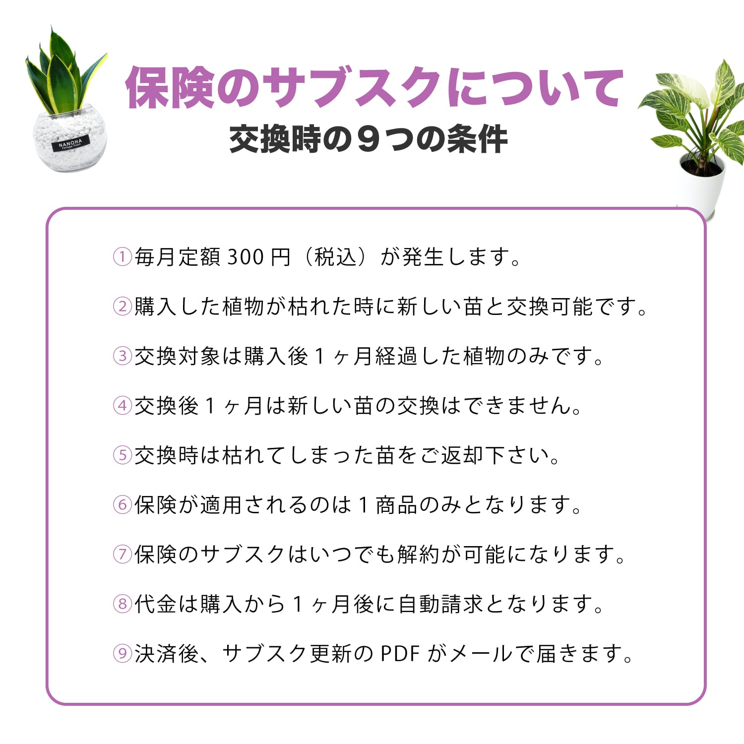 ②購入した植物が枯れた場合新しい苗を交換可能。
