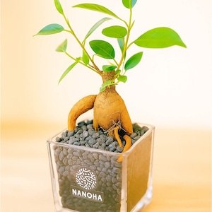 観葉植物の中でも人気の高いガジュマルと黒砂利をスクエアガラスの中で植え替えた一品。土を使っていないので、虫が湧きづらく衛生的。更にお洒落に飾れる、ミニサイズの観葉植物。