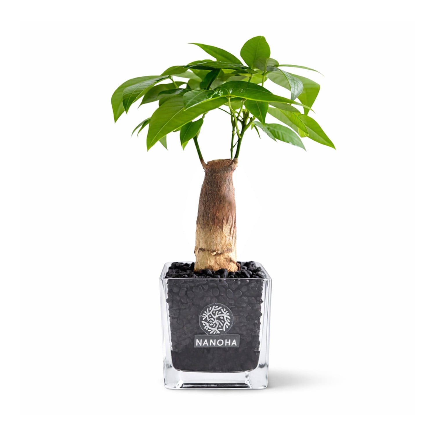 観葉植物の中でも人気の高いパキラと黒砂利をスクエアガラスの中で植え替えた一品。土を使っていないので、虫が湧きづらく衛生的。更にお洒落に飾れる、ミニサイズの観葉植物。