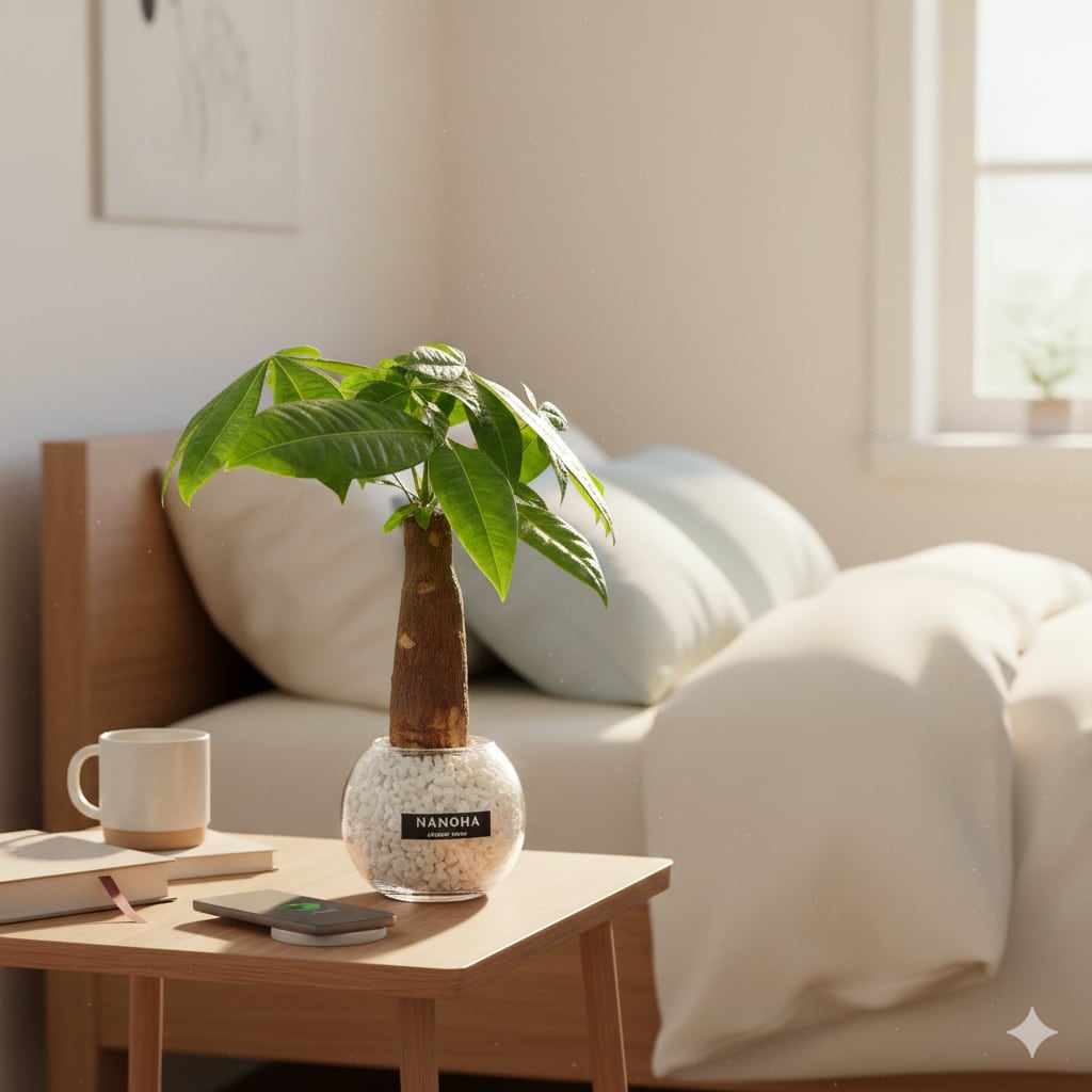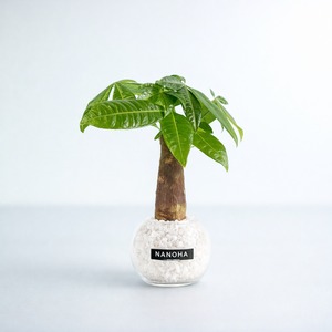 観葉植物の中でも人気の高いパキラと白玉砂利をガラスボールの中で植え替えた一品。土を使っていないので、虫が湧きづらく衛生的。更にお洒落に飾れる、ミニサイズの観葉植物。