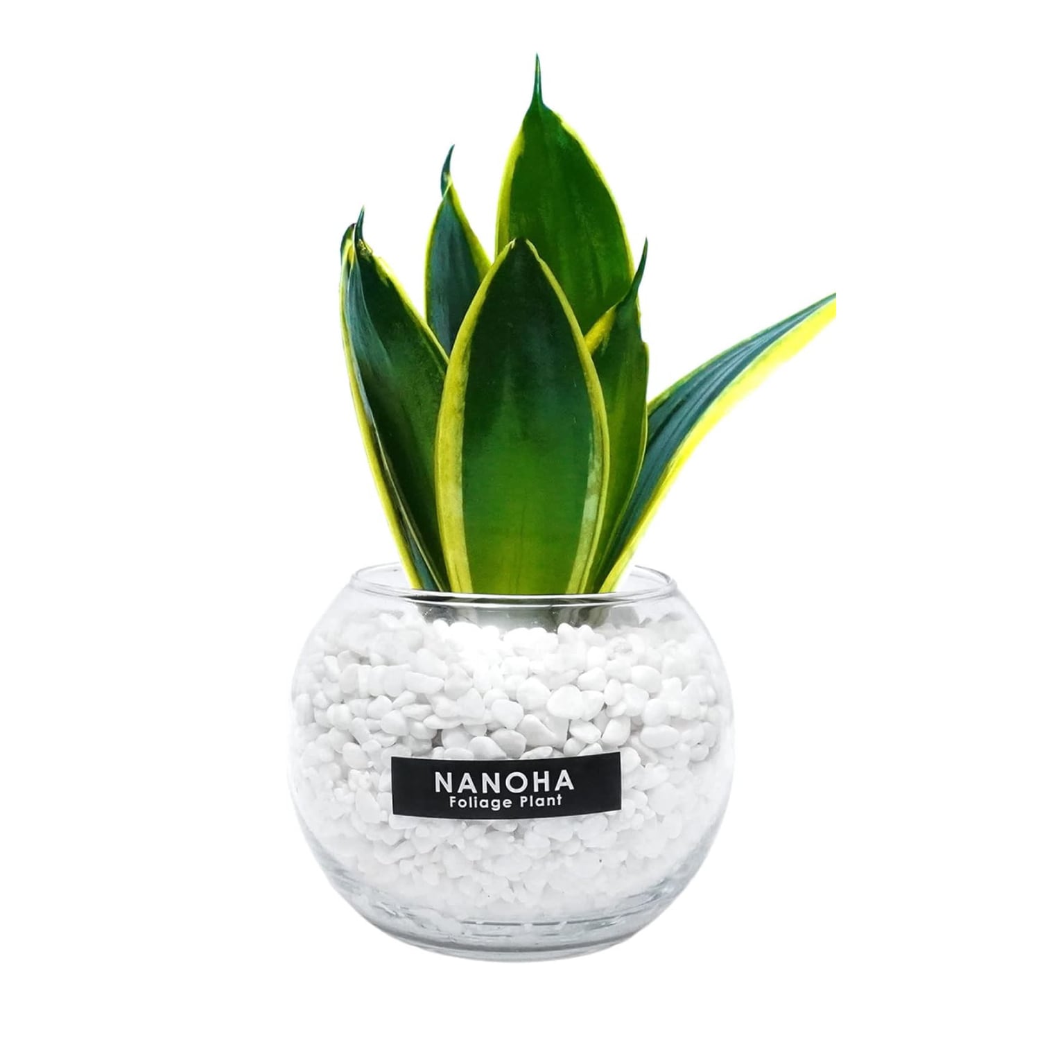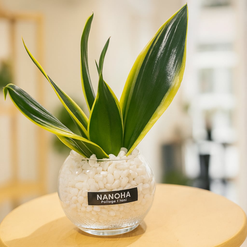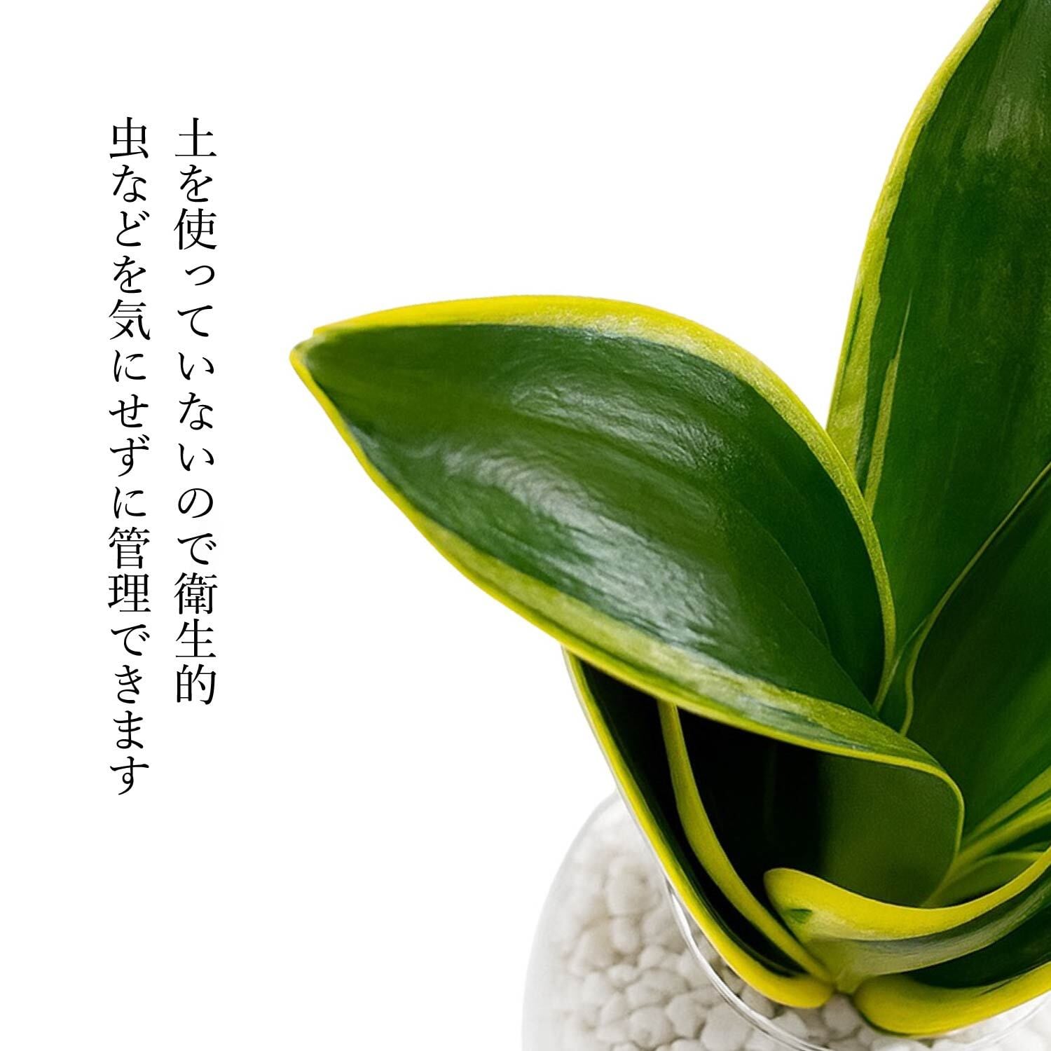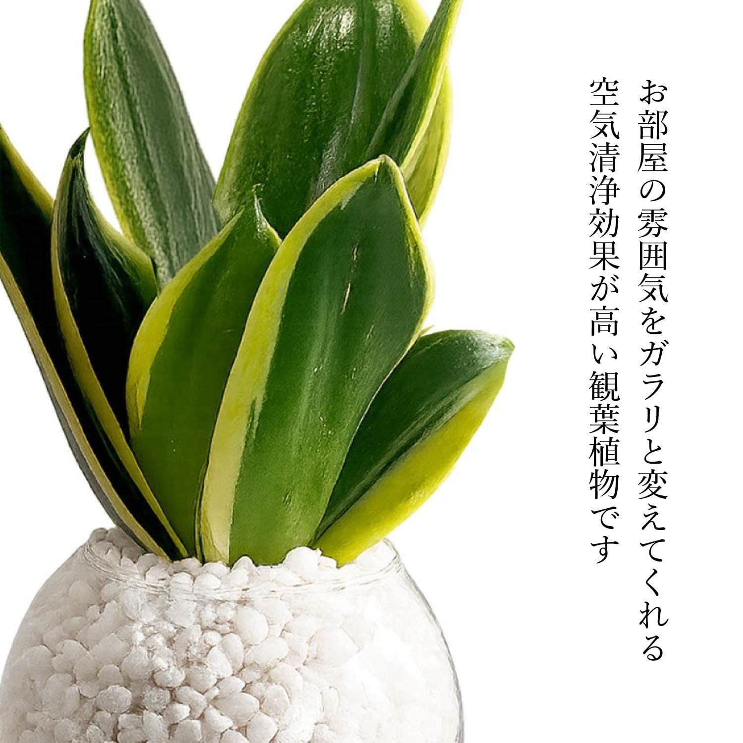 観葉植物の中でも人気の高いサンスベリアと白玉砂利をガラスボールの中で植え替えた一品。土を使っていないので、虫が湧きづらく衛生的。更にお洒落に飾れる、ミニサイズの観葉植物。