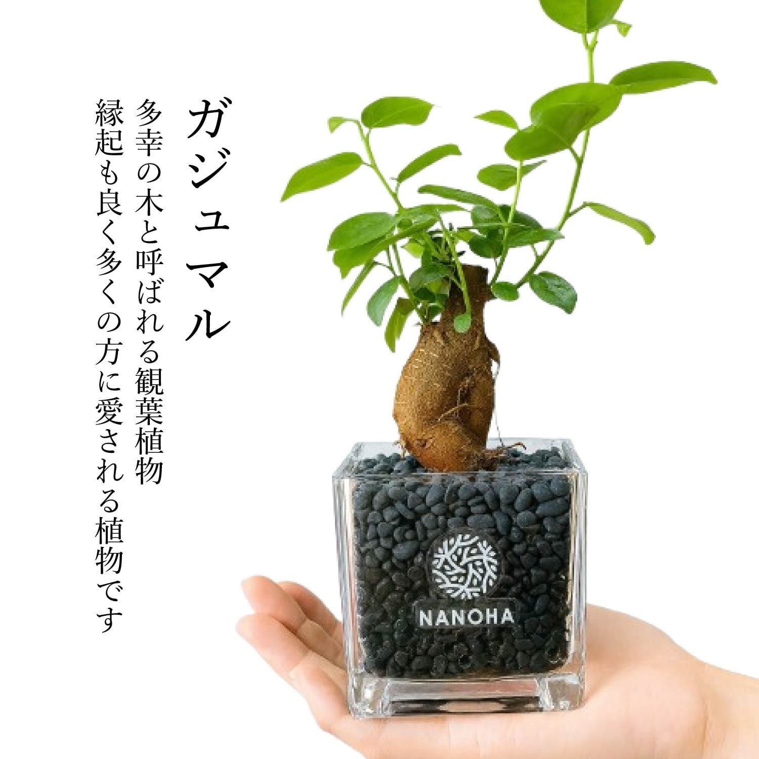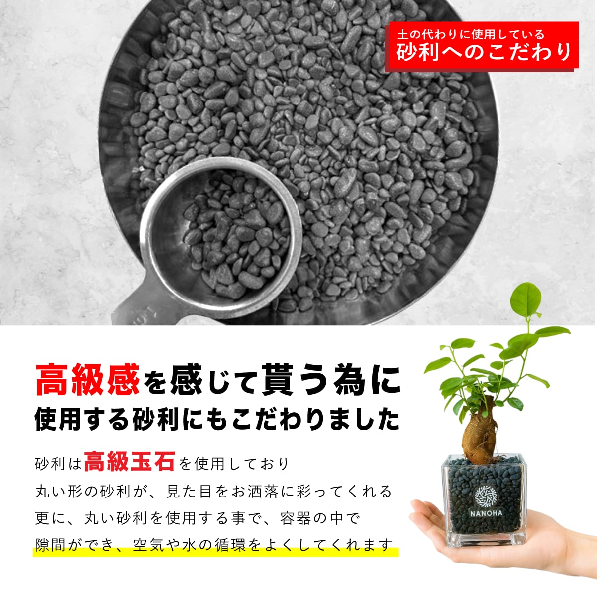 観葉植物の中でも人気の高いガジュマルとパキラとサンスベリアを黒砂利とスクエアガラスの中で植え替えた一品。土を使っていないので、虫が湧きづらく衛生的。更にお洒落に飾れる、ミニサイズの観葉植物。
