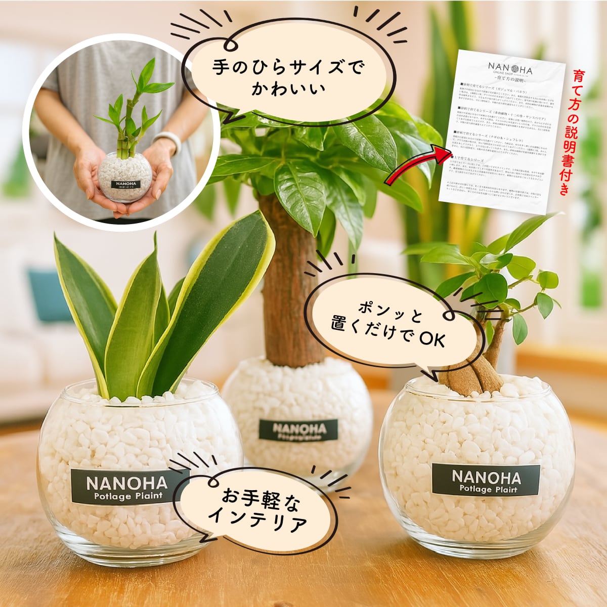 観葉植物の中でも人気の高いサンスベリアをスクエアガラスの中で植え替えた一品。黒砂利・白砂利のセット。土を使っていないので、虫が湧きづらく衛生的。更にお洒落に飾れる、ミニサイズの観葉植物。